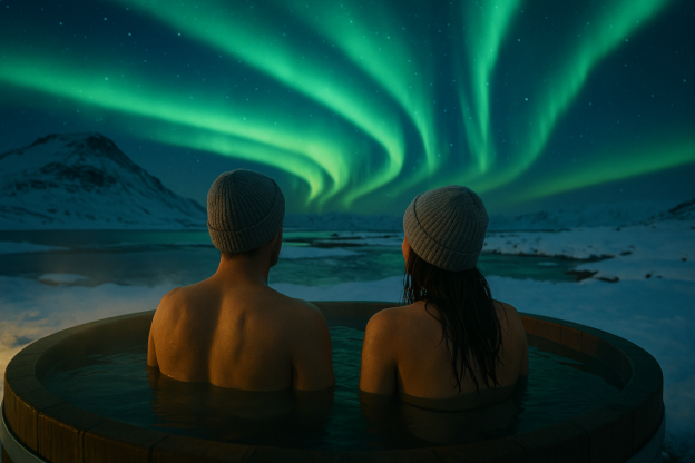 Als sie im warmen Wasser saßen, begann der Himmel sich zu verwandeln. Erst war es nur ein schwacher Schimmer, dann ein grüner Schleier, der sich über die Sterne legte. Die Polarlichter tanzten, als hätten sie diesen Moment nur für sie geschaffen.